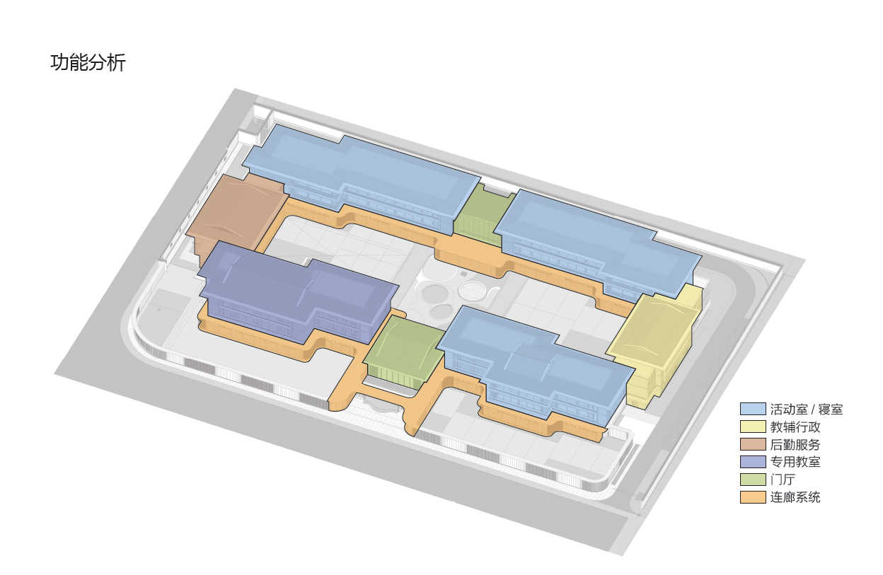 采用经典的围合式空间布局,以中心庭院为核心,四周建筑环抱形成整体。这里成为促进儿童充分互动交流的场所。本项目打破传统幼儿园封闭式走廊的设计模式,秉持“室内外空间融合、功能与体验兼顾”的核心原则。