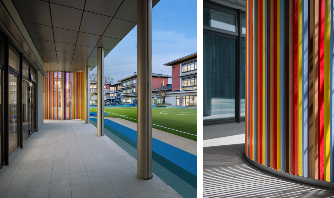 漫步在大明湖周边的街巷中,常常可以看到红砖色调的老建筑,山东省图书馆就是其中的典型代表。在本项目的整体建筑立面上,我们选用仿红砖质感涂料与木纹铝合金材料,营造出温暖的主基调。这不仅是对泉城传统民居文化的一种延续,也为幼儿园增添了浓郁的人文气息。与此同时,浅灰色铝合金与深色金属漆的运用,为立面注入了现代感;而彩釉印刷玻璃和彩色金属格栅,则进一步提升了园区的活泼氛围。