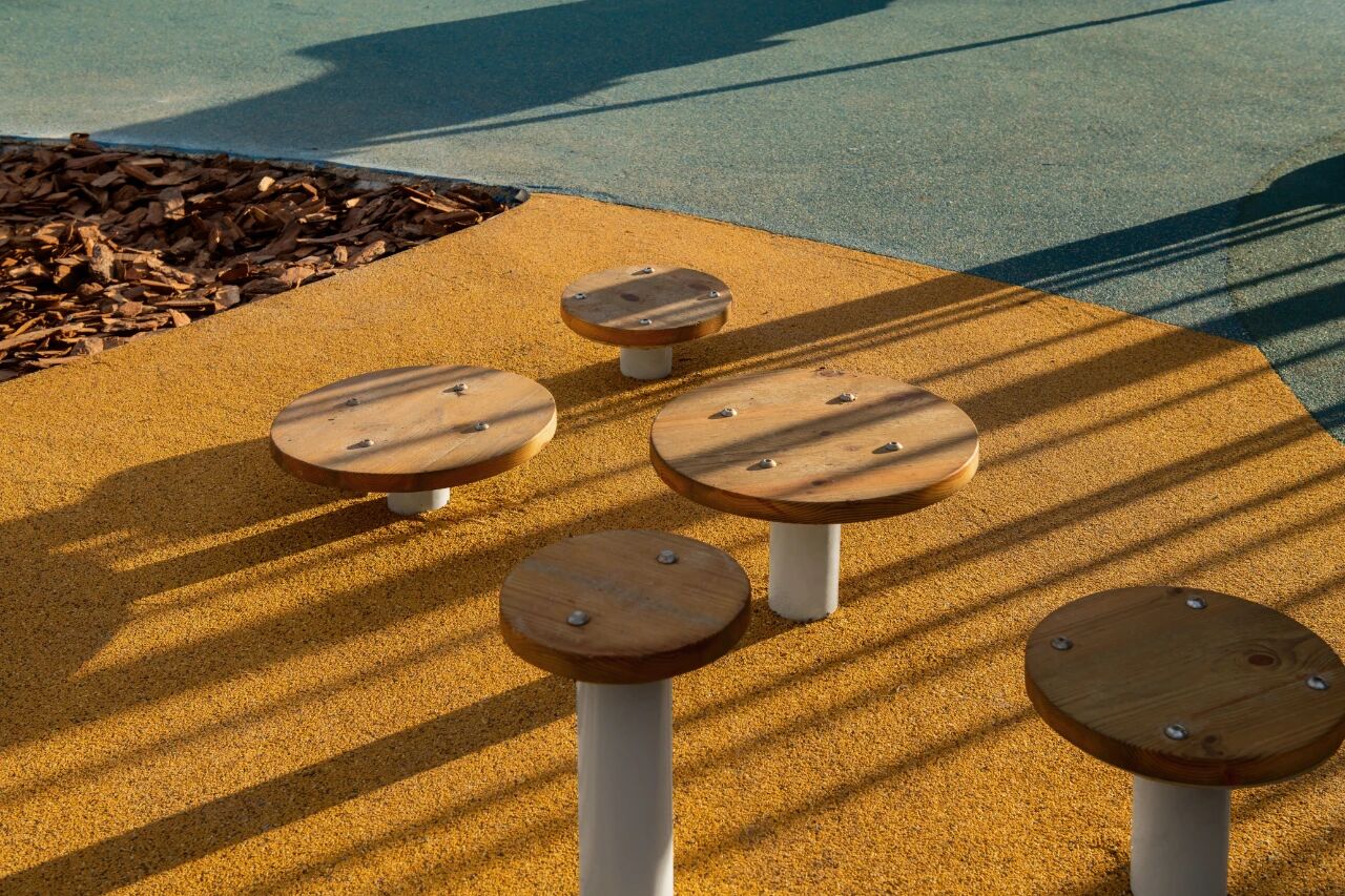 场地采用塑胶材质,确保儿童活动安全。活动布局充分契合儿童成长需求,旨在培养其身体协调能力、安全意识与色彩形态感知能力。场地中增设了整体塑胶铺面、多彩铺装、木质平台及适合幼儿的活动器材设施。
