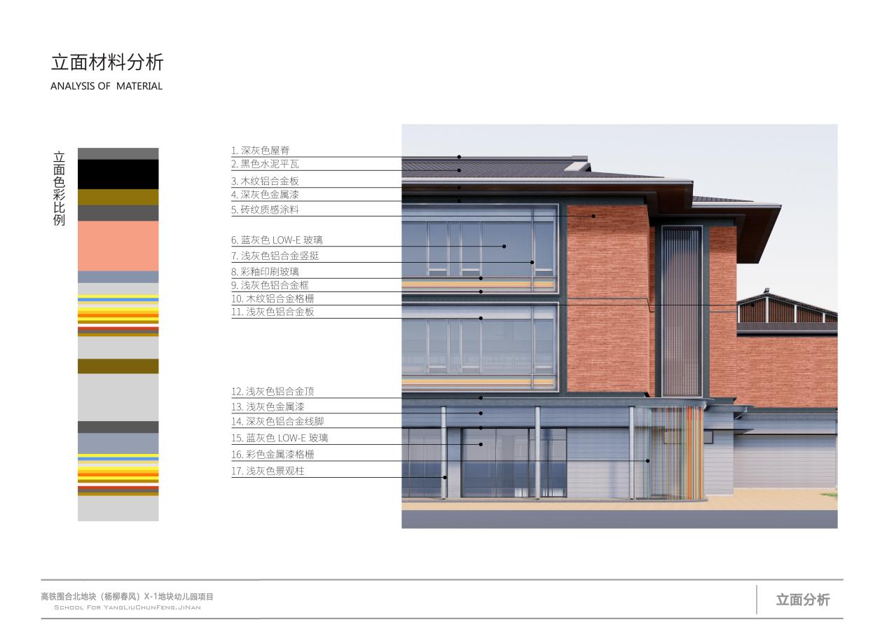 立面材料分析:建筑立面以砖纹质感涂料与木纹铝合金奠定温暖的主色调,同时运用浅灰色铝合金和深色金属漆增强立面的现代气息;彩釉印刷玻璃与彩色金属格栅的融入,则为幼儿园增添了活泼愉悦的氛围。