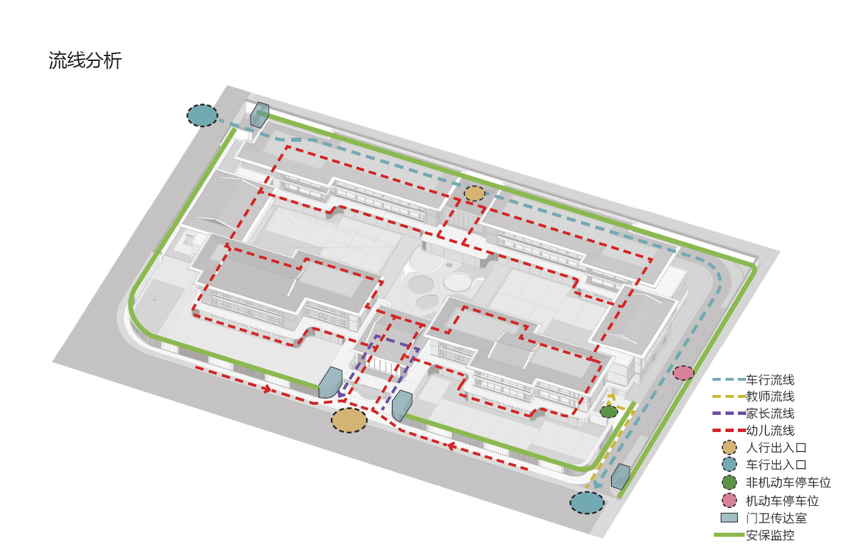 本项目场地较为有限,需容纳27个幼儿园班级,并为800余名幼儿及90多名教师提供就餐、学习与活动空间。因此,如何在设计中合理组织师生学习、工作与生活的流线,确保各区域畅通有序、互不干扰,显得尤为关键。